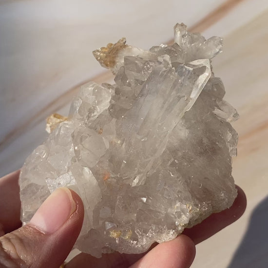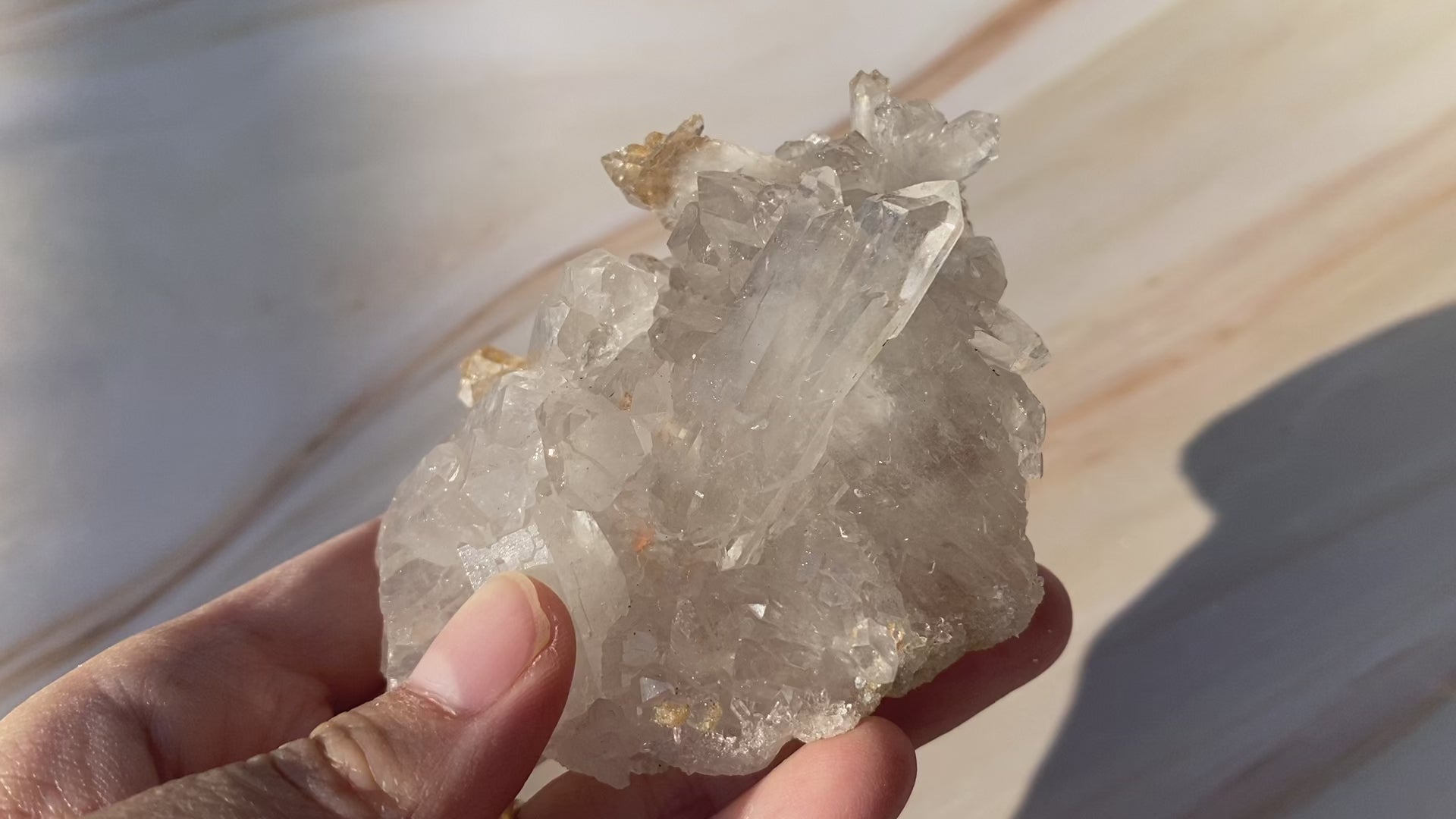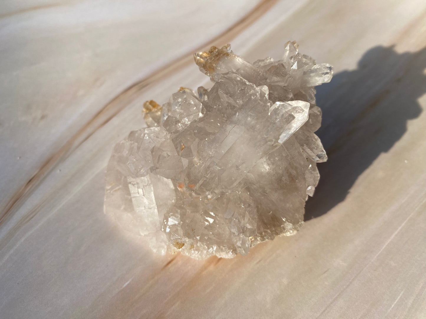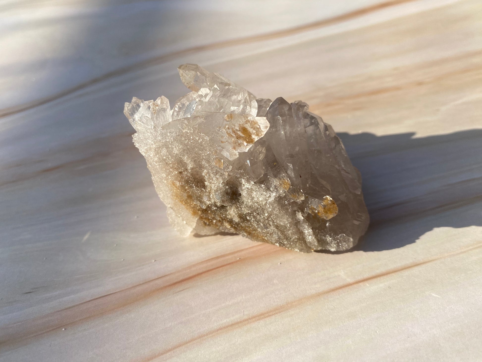 水晶ですが、茶色や金色の部分は様々な鉱物が混ざっています。